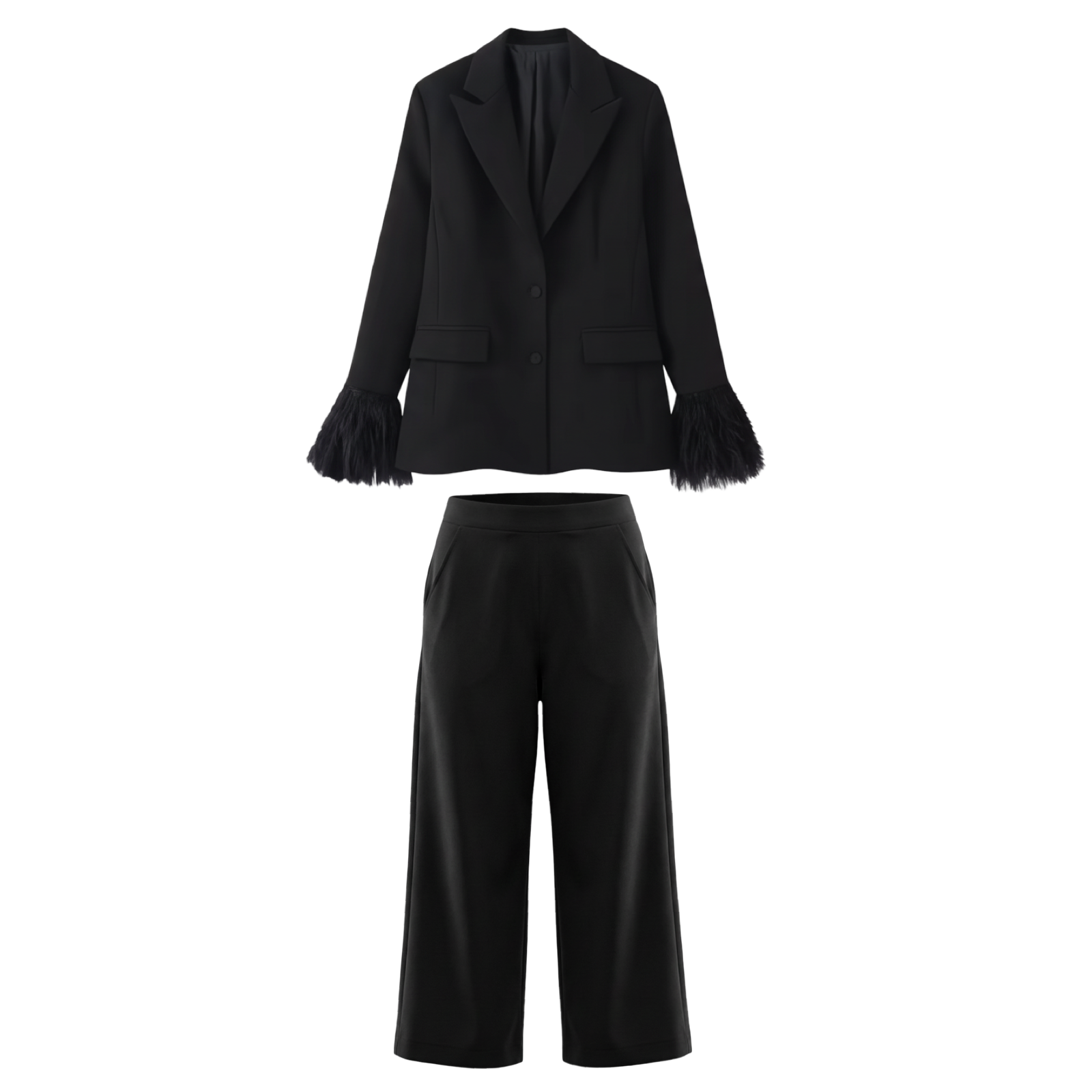 This refined two-piece suit set blends sharp tailoring with elevated detailing. Featuring a structured blazer accented with feather-trim cuffs and matching straight-leg trousers, this set delivers a confident, modern silhouette suitable for both professional and evening wear.
