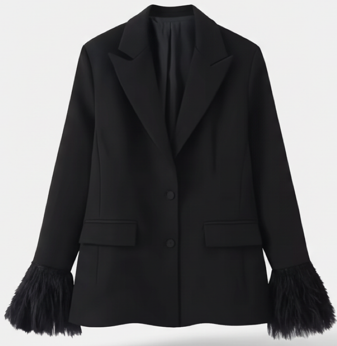 Feather-trim cuff detail on blazer sleeves
