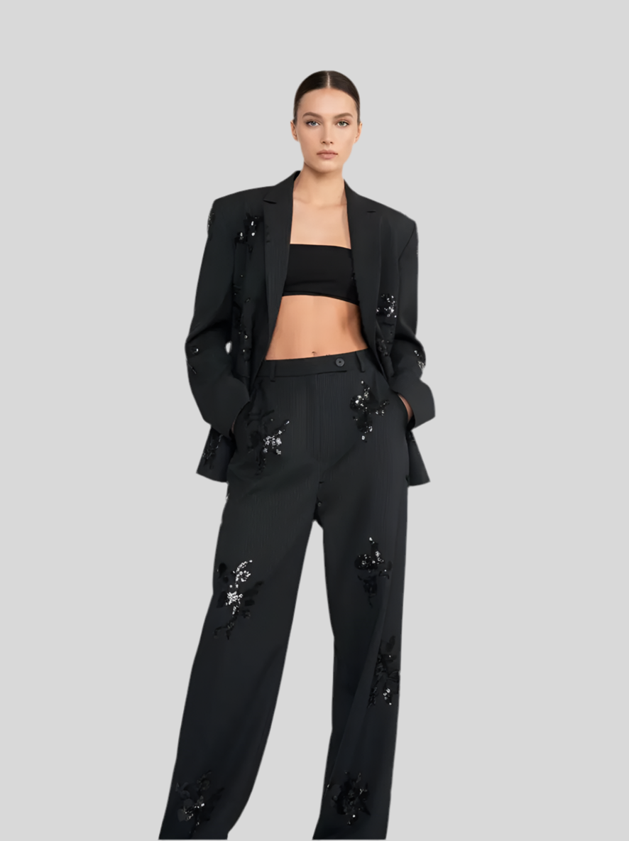 A chic two-piece set featuring a black sequin-embroidered blazer paired with wide-leg, elastic-waist pants. Crafted in a soft stretch blend for comfort and a flattering drape, this outfit delivers a sophisticated, party-ready look for evenings, special events, or elevated casual styling.