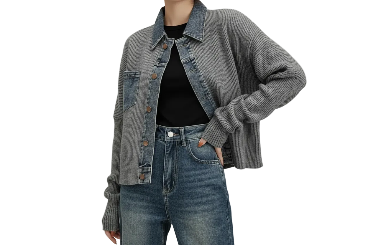 Effortlessly modern with a street-chic edge. This cropped knit cardigan jacket features contrasting denim patchwork for a layered, fashion-forward look. Designed with a relaxed silhouette and soft ribbed texture, it’s an easy transitional piece that elevates casual outfits year-round.
